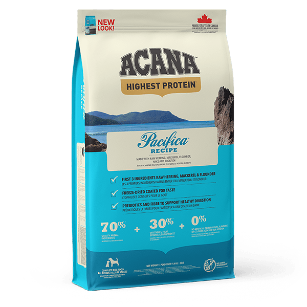 A diet rich in whole fish naturally delivers essential nutrients like Omega fatty acids in their most nourishing form. ACANA Pacifica is bursting with wild-caught herring, pilchard, flounder, hake, and rockfish. These are delivered to our kitchen fresh or raw from people we know and trust. Using Whole-Prey ratios of fish, organs, and bone, ACANA gives your dog everything they need in order to stay happy, healthy, and strong. It also has a delicious taste that they’ll love!