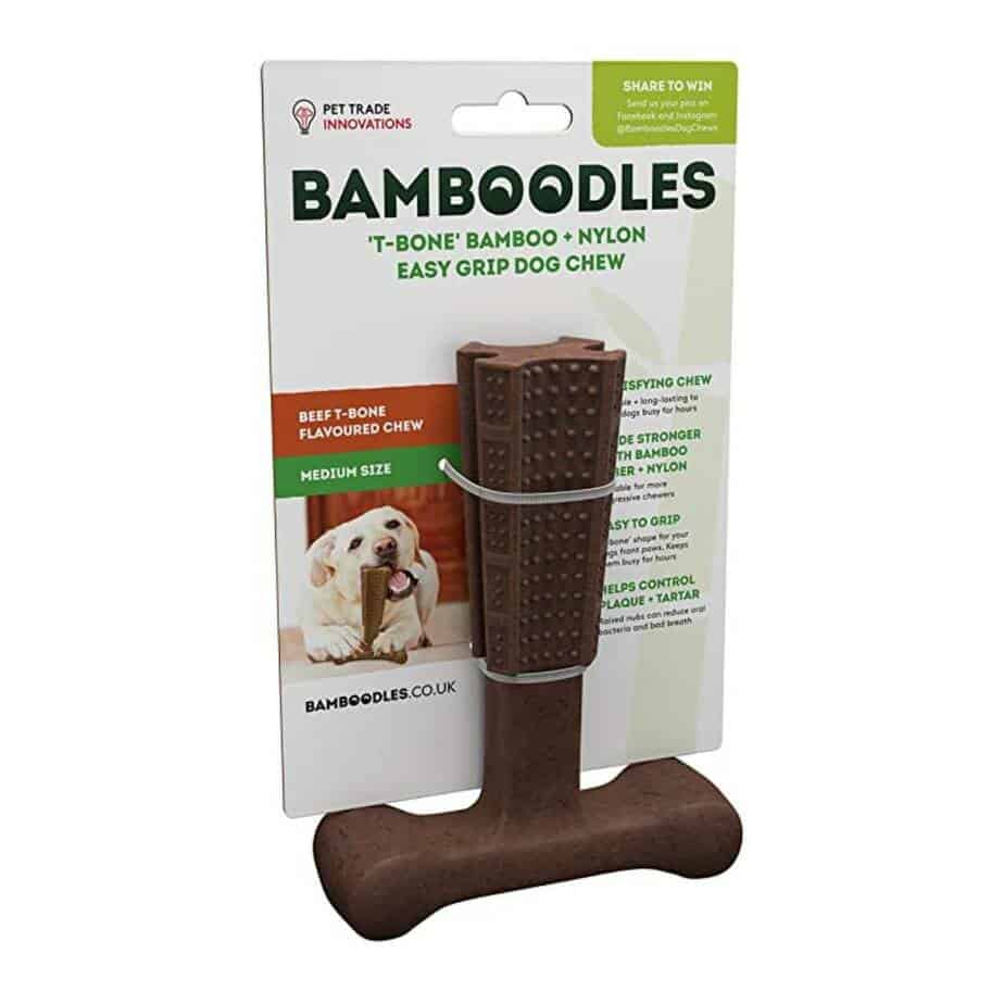 Bamboodles ‘T-Bone’ is tough. The natural strength of bamboo fibre combines with nylon fibres to create a longer-lasting, durable chew toy – suitable for all dogs, including those more aggressive chewers.