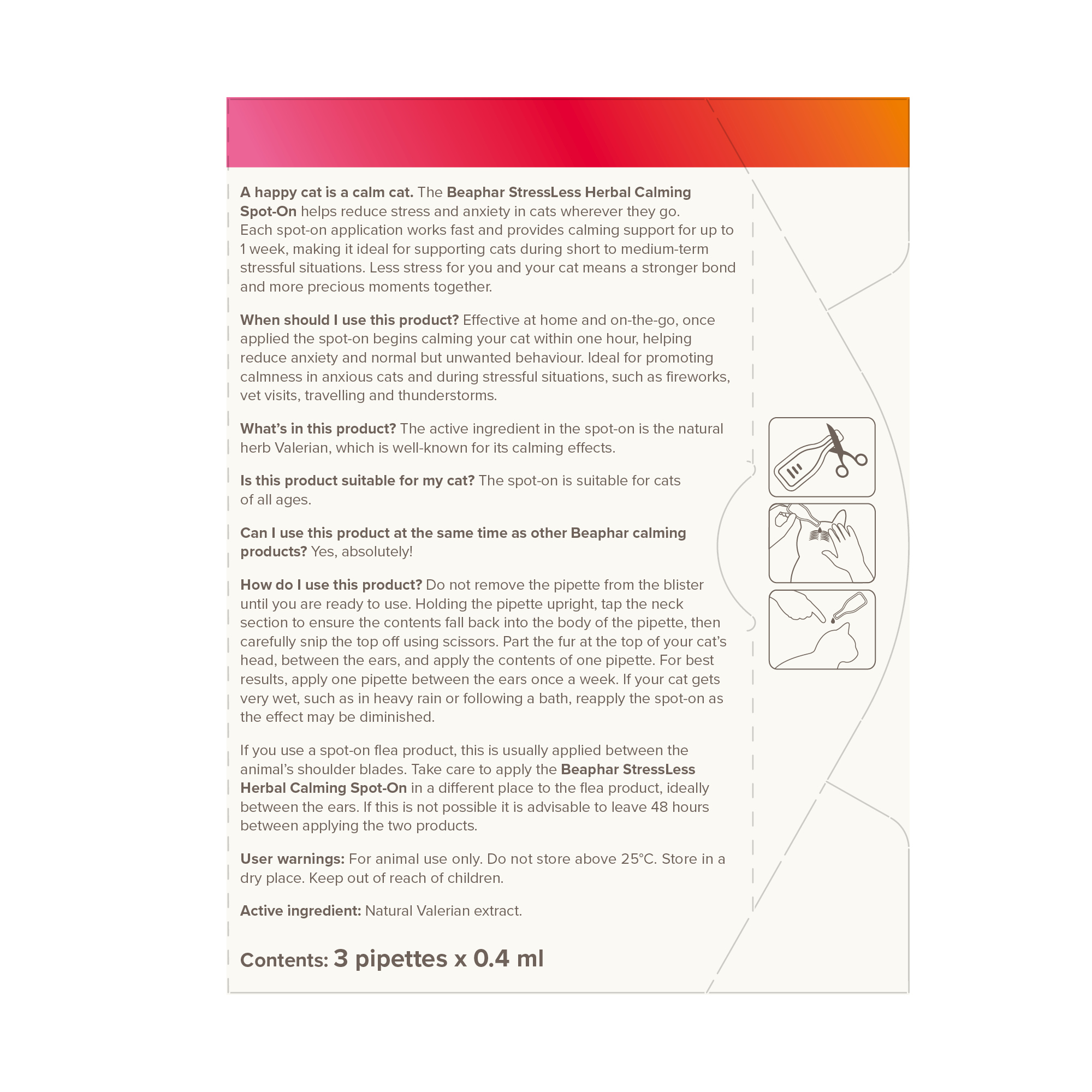ALWAYS FULLY READ THE PRODUCT LABEL AND PACKAGING BEFORE USE. Do not remove the pipette from the blister until you are ready to use the product. 1. Holding the pipette upright, tap the neck section to ensure the contents fall back into the body of the pipette. 2. Carefully snip off the top of the pipette using scissors. 3. Part the fur at the top of your cat’s head, between the ears, and apply the contents of one pipette. Beaphar StressLess Herbal Calming Spot-On will begin calming your cat within one hour of application. For best results, apply one pipette between the ears once a week. If your cat gets very wet, such as in heavy rain or following a bath, reapply the spot-on as the effect may be diminished. If you use a spot-on flea product, this is usually applied between the animal’s shoulder blades. Take care to apply the Beaphar StressLess Herbal Calming Spot-On in a different place to the flea product, ideally between the ears. If this is not possible it is advisable to leave 48 hours between applying the two products.