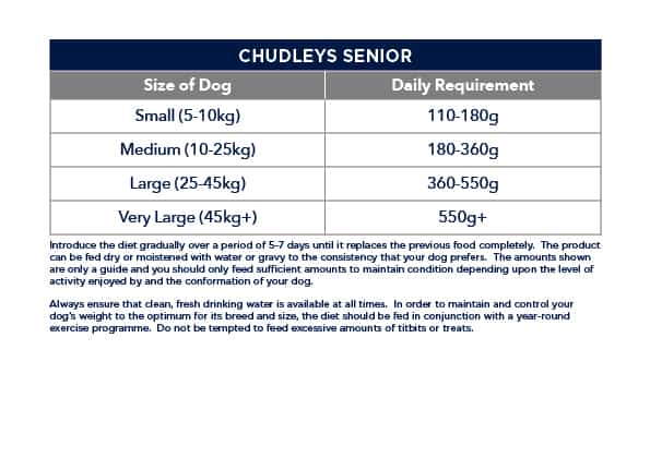 Chudleys Senior is a nutritionally complete food, designed to help support the older dog (7+) on a less active workload. The blend of functional fibres and carnitine helps with weight management and the inclusion of taurine helps support heart health. Senior benefits from the inclusion of a joint care package which helps to support the aging joints and mobility of an older dog. Like all Chudleys diets, Senior incorporates a blend of enhanced vitamins, amino acids, and trace nutrients which synergistically support a dog’s immunity, digestion, coat condition and general wellbeing.