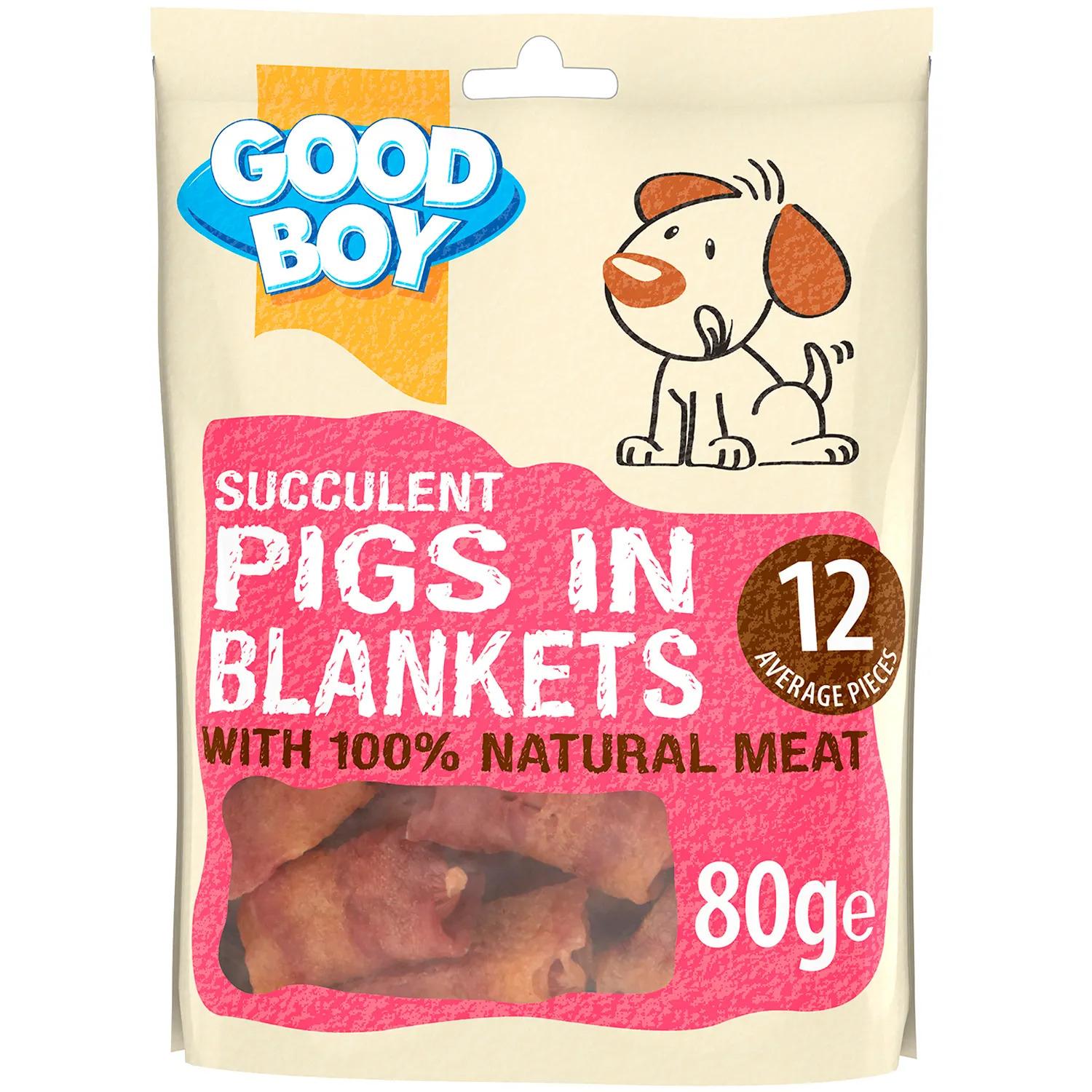 Good Boy Succulent Pigs in Blankets, a 80g bag of 100% natural meat treats for dogs. Despite its festive name, it is a popular treat available year-round.