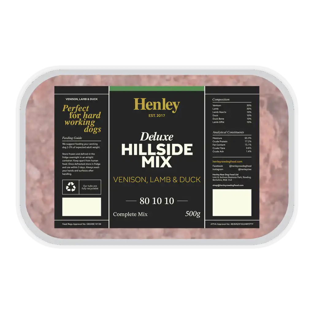 Henley Raw Dog Food – Deluxe Hillside Mix Venison, Lamb & Duck 80/10/10 500g