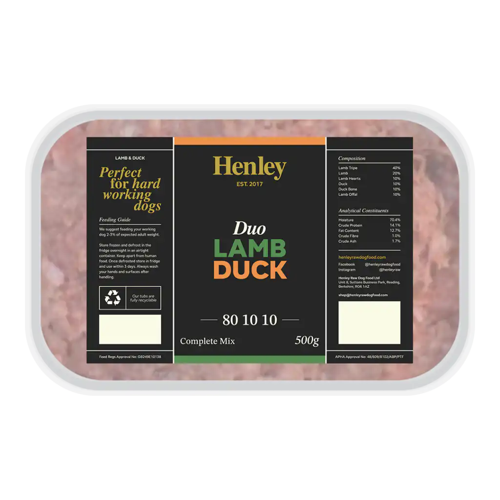 Henley Raw Dog Food – Duo Lamb and Duck in 500g. 80/10/10 a complete meal.