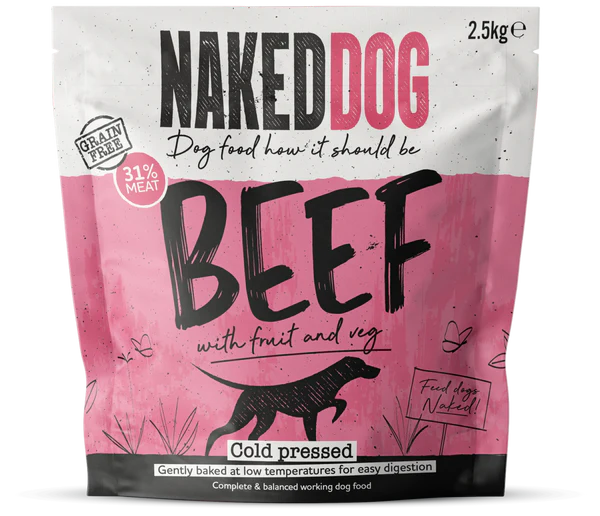 Naked Dog Beef Cold Pressed food is gently baked at low temperatures. Unlike other dry dog foods, this means that it digests very gently and is easy on your dogs’ tummy.
