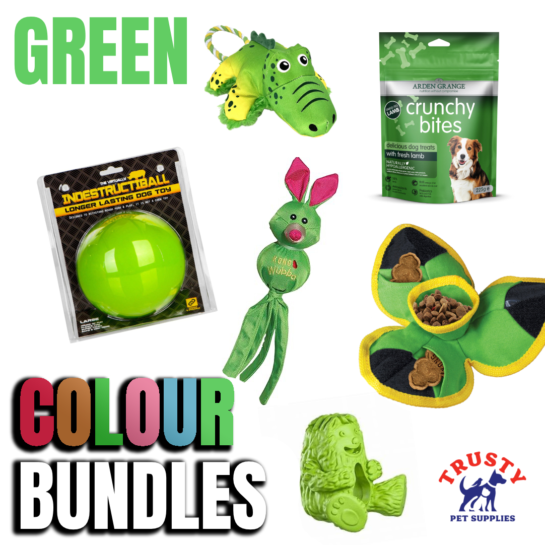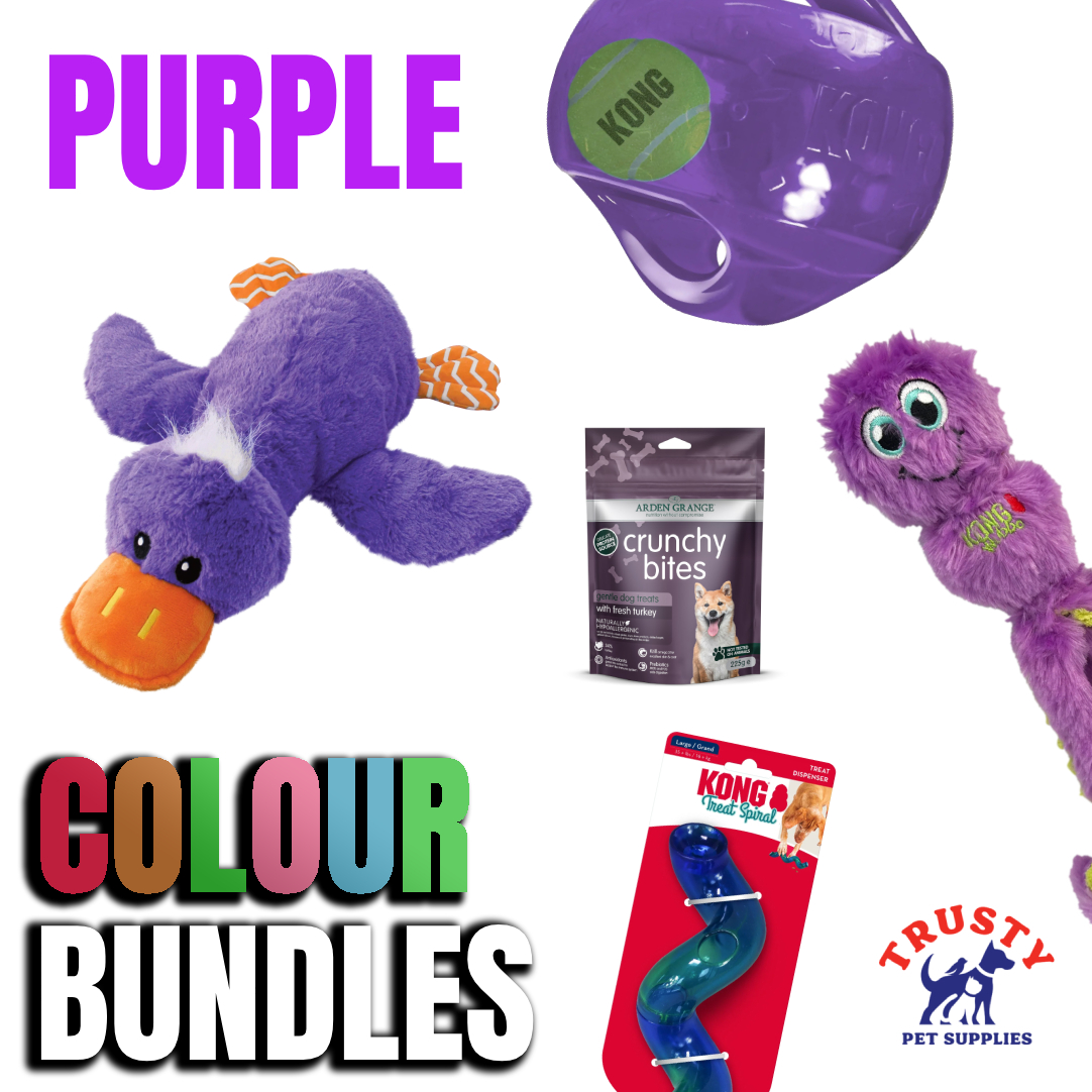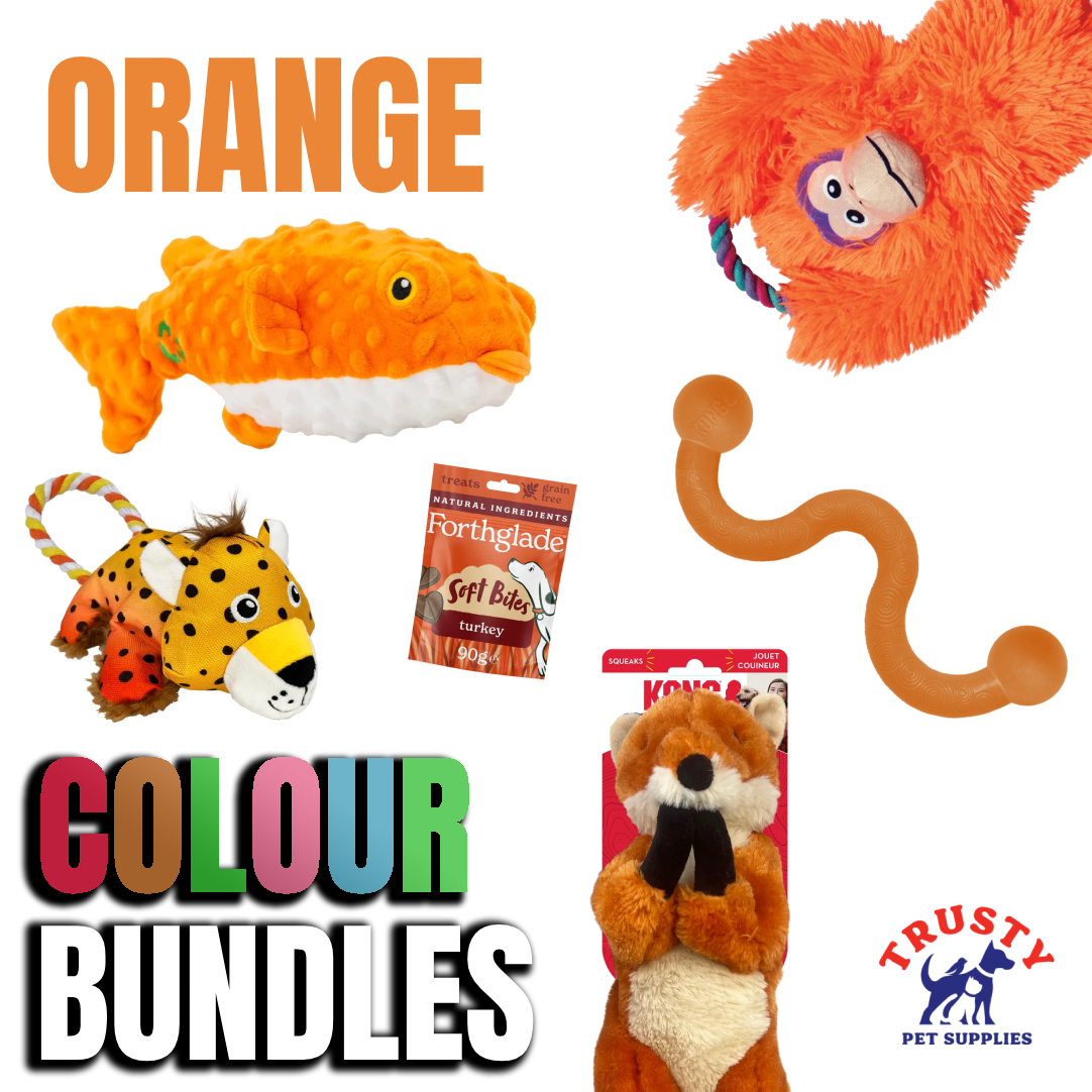 Get ready for a surprise with the Trusty Pet Supplies Blue, Green, Orange, Red or Purple Dog Toy Bundle! This bundle box contains a variety of dog toys and treats.